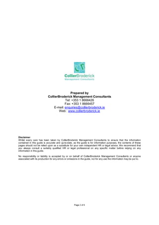 This document serves as a brief guide to the records required for inspections by the National Employment Rights Authority (NERA), highlighting essential documentation employers must retain to ensure compliance with employment legislation. It outlines a variety of records, including employee details, terms of employment, working hours, payroll information, and compliance with specific acts such as those protecting young workers. Although it identifies key records necessary for inspection, it emphasizes that a comprehensive checklist from NERA will not be available until further establishment of the authority.