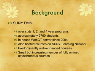 The document discusses SUNY Delhi College of Technology's selection of a new learning management system to replace their existing WebCT system. They chose Moodle, an open source LMS hosted by Moodlerooms. This allowed them to save costs compared to an in-house or proprietary system. The transition was completed over the course of 2008 and faculty, students, staff, and administration were pleased with the new system overall.