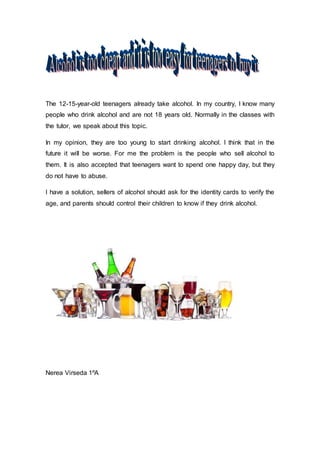 A student discusses the issue of underage drinking in their country, noting that many teenagers drink alcohol before the legal age of 18. They believe teenagers are too young to drink and that it could lead to problems later. The main problem is sellers providing alcohol without checking identification. The student proposes a solution that sellers should verify age by checking identity cards and that parents should monitor their children to prevent underage drinking.