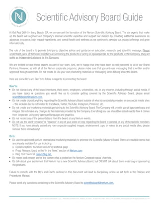 Nerium has formed a Scientific Advisory Board consisting of six experts to provide guidance on education, research, and scientific messaging as the company expands its product offerings internationally. The board will advise Nerium but not endorse products. Brand partners are instructed to only use Nerium-approved materials and messaging about the board and not contact board members directly. Failure to comply with the guidelines could result in disciplinary action.