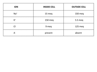 This document discusses the Nernst equation and its role in determining the membrane potential of cells. It introduces concepts like the resting membrane potential, selective permeability of cell membranes to different ions, and the Gibbs-Donnan equilibrium. It then explains the Nernst equation, which calculates the equilibrium potential for each ion based on its concentration gradient across the cell membrane. Finally, it discusses the Goldman-Hodgkin-Katz equation, which integrates the effects of multiple ions, and the role of the sodium-potassium pump in maintaining ion concentration gradients.