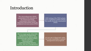 Nerve conduction studies (NCS) involve stimulating peripheral nerves and recording the electrical responses in muscles or other nerves. NCS can localize lesions to specific locations (e.g. root, plexus) and characterize the pathology (e.g. demyelination, axon loss). For motor NCS, responses are recorded from muscles. Sensory NCS records small responses from nerves. Demyelination and axon loss can be detected based on changes in latency, conduction velocity and response amplitude. Wallerian degeneration occurs distally after axon disruption and impacts NCS results over time. Reinnervation of muscles can occur through collateral sprouting or axon regrowth.