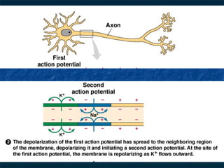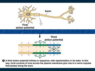 3) When the membrane potential reaches threshold, voltage-gated sodium channels open, sodium rushes in, and the inside becomes positively charged, allowing the impulse to move along. Then, voltage-gated potassium channels open and potassium exits, repolarizing the cell back to its resting potential.