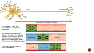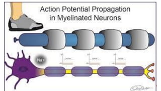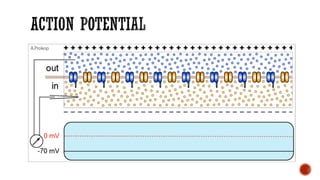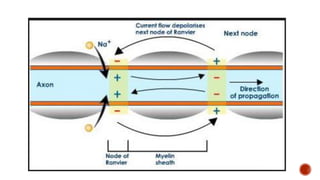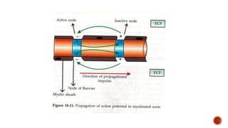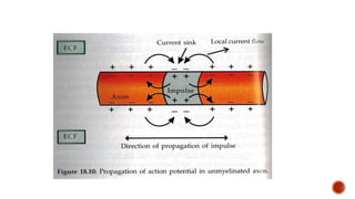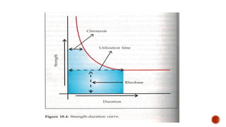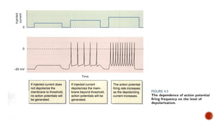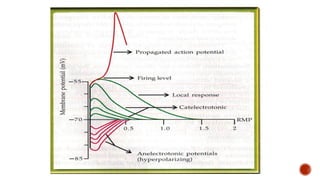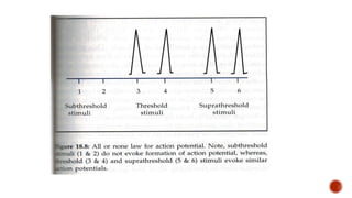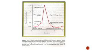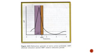 The document discusses the excitability of neural tissue, focusing on how neurons transmit information through electrical signals via graded and action potentials. It details the processes of depolarization, repolarization, and the role of sodium and potassium ions in action potential generation, along with the significance of threshold levels and refractory periods. Additionally, it explains the physiological implications of various stimuli on nerve excitability and the all-or-none law governing action potentials.