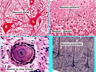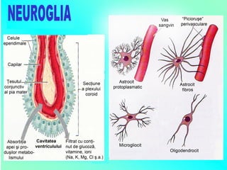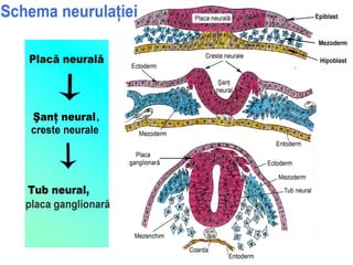 Documentul detaliază procesele de embriogeneză și dezvoltarea sistemului nervos, incluzând formarea tubului neural și a crestelor neurale, precum și rolul neuronilor și celulelor gliale. Acesta explică structura neuronilor, axonilor, sinapselor și mecanismele de regenerare a nervilor după leziuni. De asemenea, se discută despre tipurile de receptori, sinapse și organizația cortexului cerebral.