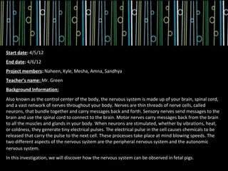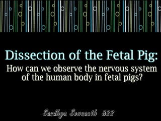 The project members dissected a fetal pig to observe its nervous system. They hypothesized that the nervous system would operate similarly in pigs and humans. During the dissection, they identified key parts of the brain including the cerebrum, cerebellum, and brain stem. The three membranes surrounding the brain - dura mater, arachnoid mater, and pia mater - were also observed. The conclusion was that the hypothesis was correct, as the human nervous system could be accurately observed in the fetal pig.