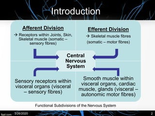 The document provides a detailed overview of the human nervous system, including its divisions, terminology, neuron types, synapses, and neurotransmitters. It also describes the organization and functions of the brain, specifically focusing on the cerebrum, its lobes, and associated motor areas. Additionally, it discusses cerebrospinal fluid, its properties, and the protective structures surrounding the central nervous system.