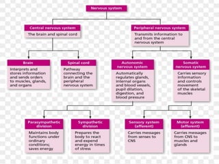 The nervous system is made up of nerves and neurons that transmit signals around the body. It has two main parts: the central nervous system (CNS) and the peripheral nervous system. The CNS contains the brain and spinal cord, which act as control centers. The peripheral nervous system connects the CNS to the rest of the body through cranial nerves and spinal nerves. It contains sensory nerves that transmit information to the CNS, and motor nerves that transmit signals from the CNS to effectors like muscles and glands. The autonomic nervous system regulates involuntary functions through the sympathetic and parasympathetic nerves.