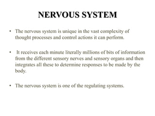 The document provides information about the nervous system. It discusses that the nervous system is divided into the central nervous system (CNS) and peripheral nervous system (PNS). The CNS consists of the brain and spinal cord. The PNS includes the autonomic nervous system and relays information between the CNS and the body. Within the CNS, the brain is the center of neural activity and integration. Neurons are the basic functional units that carry and transmit electrochemical signals throughout the nervous system.