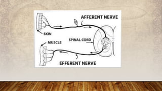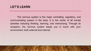 The nervous system has three main functions: (1) receive information from inside and outside the body, (2) interpret received information, and (3) make the body respond accordingly. It consists of the central nervous system, made up of the brain and spinal cord, and the peripheral nervous system of nerves throughout the body. The peripheral nervous system has two divisions - the somatic division for voluntary movement and reflexes, and the autonomic division for involuntary functions like digestion.