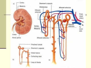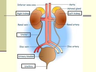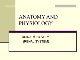 The urinary system, also known as the renal system, is responsible for filtering blood and producing urine. The kidneys filter waste from the blood to produce urine, which travels through the ureters to the bladder for storage and then exits through the urethra. The functional unit of the kidneys is the nephron, which filters blood in the glomerulus and reabsorbs necessary substances or secretes waste in the tubular component to regulate water, electrolyte, and acid-base balance.
