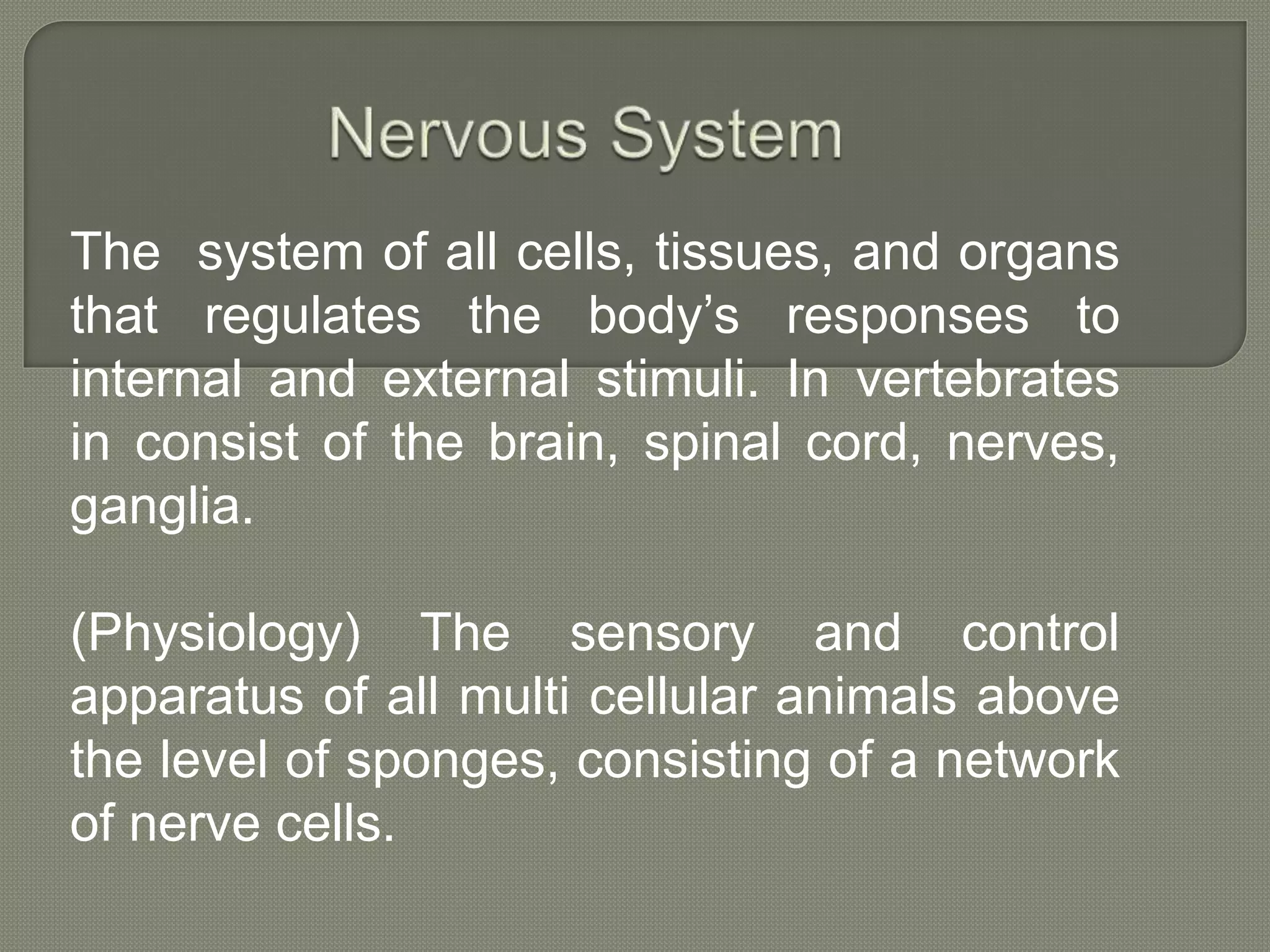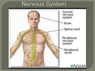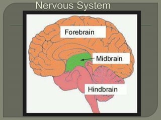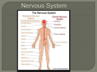 The nervous system consists of the brain, spinal cord, nerves, and ganglia. It regulates responses to internal and external stimuli. The central nervous system includes the brain and spinal cord. The peripheral nervous system is outside the central nervous system and includes cranial and spinal nerves. The brain is divided into the hindbrain, midbrain, and forebrain. It serves functions like imagination, memory, speech, movement, and hormone secretion. Neurons and glial cells make up brain tissue and neurons communicate via synapses.