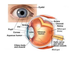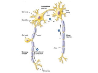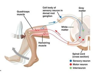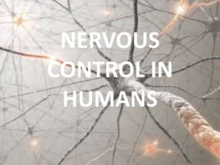 The document describes the human nervous system. It discusses the central nervous system (CNS) which includes the brain and spinal cord for coordination. The peripheral nervous system (PNS) consists of nerves that coordinate and regulate body functions. It distinguishes between voluntary actions initiated by conscious decision and involuntary reflex actions. A nerve impulse is an electrical signal that passes along nerve cells called neurons. A simple reflex arc involves a receptor, sensory neuron, relay neuron, motor neuron, and effector. Synapses allow impulses to travel between neurons via the release of neurotransmitters. Sense organs such as the eye respond to specific stimuli like light. The eye contains structures like the iris, lens, retina and cornea that help focus light and detect