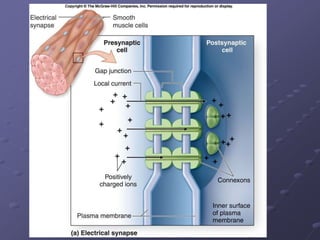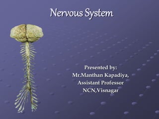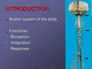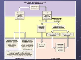The nervous system can be divided into the central nervous system (CNS) and peripheral nervous system (PNS). The CNS consists of the brain and spinal cord and is responsible for integrating sensory information and coordinating motor commands. The PNS has two parts - the cerebrospinal part made up of cranial and spinal nerves, and the autonomic nervous system. There are two main cell types in the nervous system - neurons, which transmit signals, and neuroglia, which provide support and insulation. The autonomic nervous system has two divisions - the parasympathetic and sympathetic systems, which work in opposition to activate "rest and digest" and "fight or flight" responses respectively.
