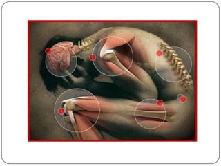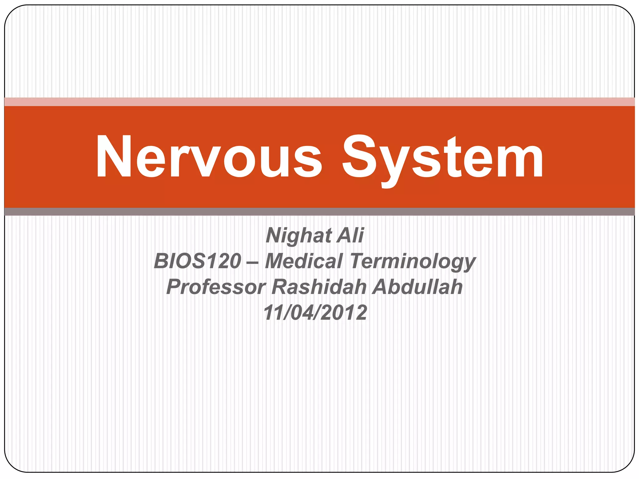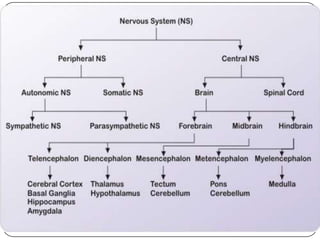 The nervous system is made up of the central nervous system (brain and spinal cord) and the peripheral nervous system. The presentation focuses on two suffixes related to the nervous system: -phasia, relating to speech, and -esthesia, relating to sensation. Aphasia refers to loss of ability to communicate through language and can result from stroke or head injury. Paresthesia is a burning or tingling sensation that can be a symptom of neurological disorders or nerve damage. Hyperesthesia is increased sensitivity of the senses.