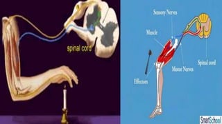 The document summarizes the main components and functions of the nervous system. It describes the peripheral nervous system, which includes the somatic and autonomic nervous systems. The somatic system controls voluntary skeletal muscles while the autonomic system involuntarily controls cardiac, smooth muscles and glands. It also describes the central nervous system including the brain and spinal cord. The brain is divided into the cerebrum, cerebellum and brainstem. The cerebrum controls higher functions while the cerebellum controls balance and motor coordination. The brainstem consists of the midbrain, pons and medulla that help regulate vital functions. The spinal cord carries signals between the brain and body and contains dorsal and ventral roots that receive and send signals