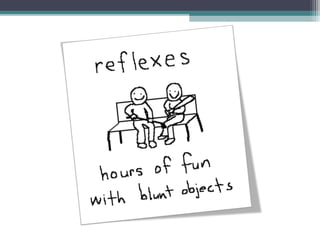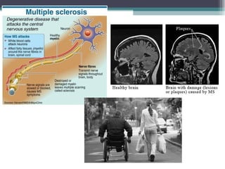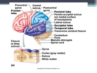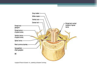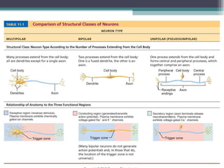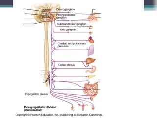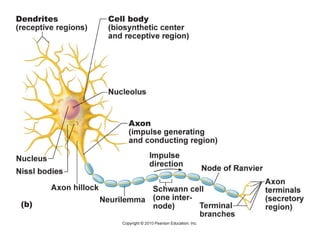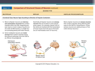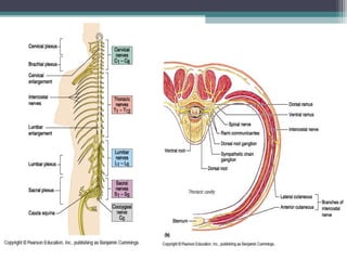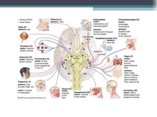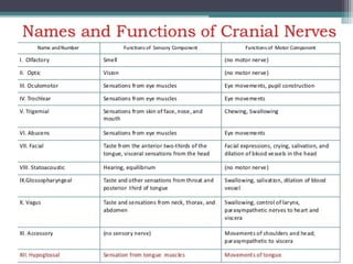 The nervous system consists of the central nervous system (brain and spinal cord) and the peripheral nervous system (nerves). It detects internal and external changes, processes sensory information, and initiates motor responses. The nervous system has three main functions - sensory input, integration of input, and motor output responses. It works through neurons, which communicate via electrochemical signals called nerve impulses.