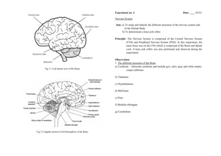 This document summarizes an experiment on the nervous system. It describes the main structures of the brain including the cerebrum, thalamus, hypothalamus, midbrain, pons, medulla oblongata, and cerebellum. It also describes the spinal cord as an elongated cylindrical structure suspended in the vertebral canal surrounded by meninges and CSF. Finally, it examines the knee jerk reflex, describing the reflex arc and sequence where a hammer hitting the patellar tendon causes sensory neurons to fire, sending a signal to the spinal cord and then back to the quadricep muscle, causing it to contract and straighten the leg.