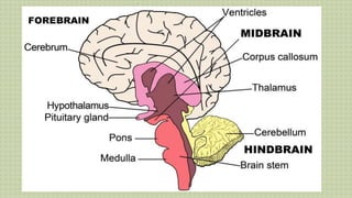 2) The central nervous system is made up of the brain and spinal cord. The brain is divided into the cerebrum, cerebellum, and brain stem. The cerebrum controls higher thought processes while the cerebellum controls muscle coordination.