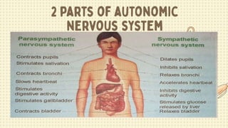 1) The document discusses the nervous system, which controls other parts of the body and receives signals from inside and outside the body. It describes the main parts of the nervous system including neurons, the central nervous system, and the peripheral nervous system.
