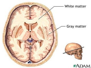 The document summarizes key aspects of the central nervous system, including: 1) The spinal cord contains grey matter on the inside consisting of neuron cell bodies, and white matter on the outside consisting of nerve fibers. 2) Reflex actions are immediate responses to a specific stimulus without conscious control, such as the knee jerk reflex. 3) A reflex arc consists of a receptor, sensory neuron, reflex center in the spinal cord or brain, motor neuron, and effector muscle or gland. 4) A conditioned reflex is a learned response acquired through experience that was originally not an effective stimulus, such as Pavlov's experiment where dogs learned to salivate at the sound of a tone through association with food.