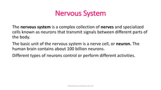 The nervous system is made up of neurons that transmit signals between different parts of the body. The basic unit is the neuron, which contains a cell body, dendrites that receive signals, and an axon that transmits signals. Neurons transmit signals through electrical and chemical processes. The nervous system is divided into the central nervous system (brain and spinal cord) and peripheral nervous system (nerves). The brain is the most complex part and is divided into the cerebrum, cerebellum, and brainstem. The cerebrum controls functions like learning, reasoning, and emotions. The nervous system allows for coordination of voluntary and involuntary body functions.
