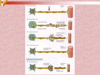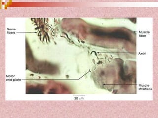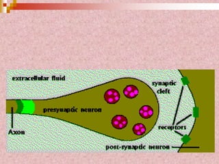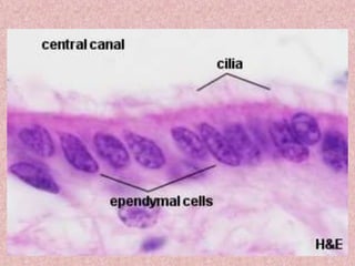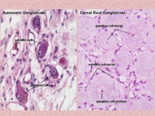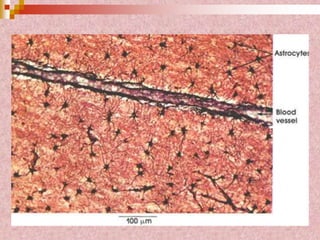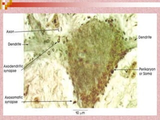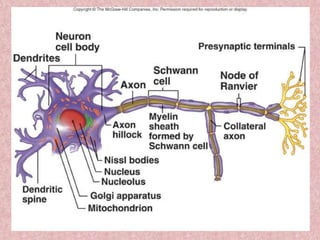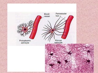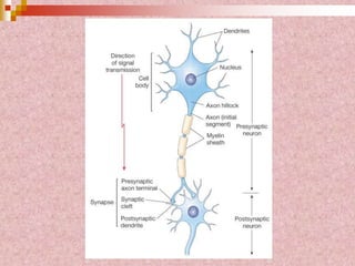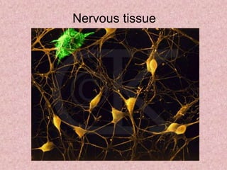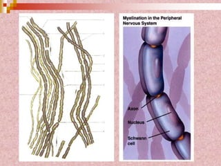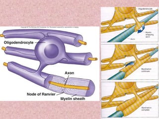 Neural tissue conducts electrical impulses and transmits signals between the central nervous system and other body structures. It develops through processes like cell proliferation, differentiation, migration, and outgrowth of neuronal processes. Neural tissue contains neurons, which generate and transmit nerve impulses, and neuroglia, which support and protect neurons. Neurons have a cell body, dendrites that receive signals, and an axon that conducts signals away from the cell body. Neuroglia include astrocytes, oligodendrocytes, ependymal cells, and microglia. Myelinated axons allow for faster signal conduction than unmyelinated axons.