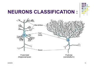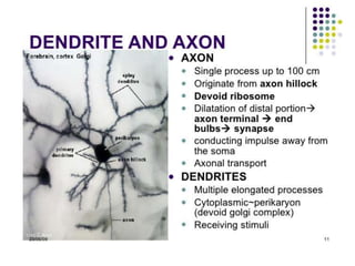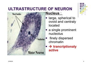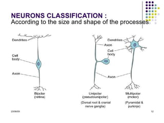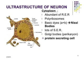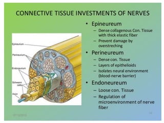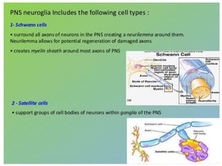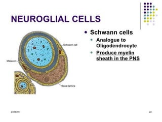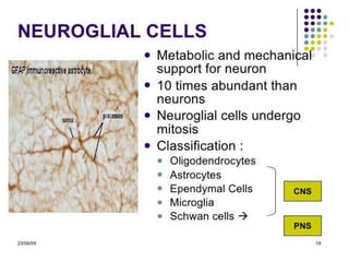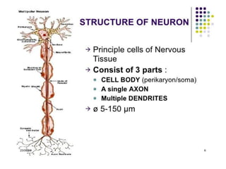 Nervous tissue controls the activity of all body tissues and is composed of neurons and neuroglia. The central nervous system comprises the brain and spinal cord, while the peripheral nervous system includes ganglia and peripheral nerves. Neurons are specialized cells that transmit electrical signals, while glial cells provide support and insulation. The key cell types involved include neurons, astrocytes, oligodendrocytes, microglia, and ependymal cells.