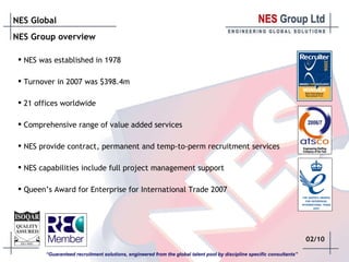 NES was established in 1978 and has a turnover of $398.4 million with 21 offices worldwide. They provide contract, permanent, and temporary-to-permanent recruitment services across many disciplines with access to over 300,000 candidate resumes through their global database systems. NES offers a range of value-added services for contractors including assistance with visas, medical exams, transportation, and payroll processing through their international network.