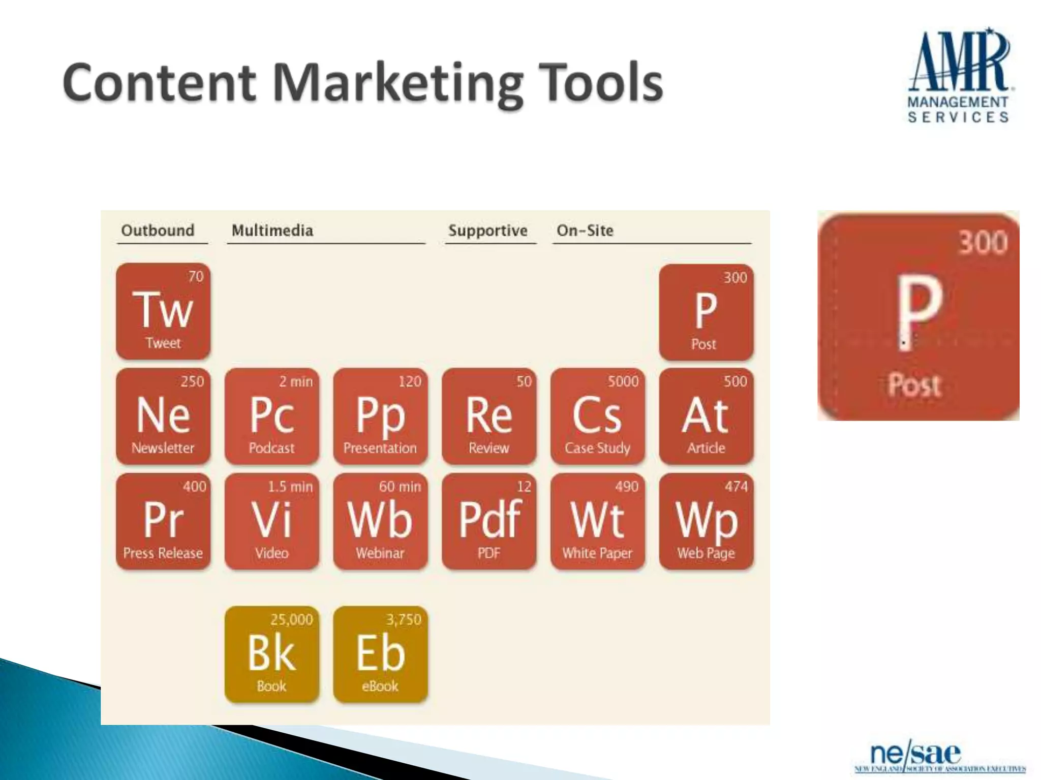 The document discusses managing content to add value for members and grow membership. It emphasizes gathering, curating, and distributing important information from various sources to share with members and save them time. This establishes the association as a trusted resource and hero to its members. It provides a content marketing formula of publishing different types of content on a daily, weekly, monthly, quarterly, biannual and annual basis across various channels. It also presents a "Periodic Table of Content Elements" with different content marketing tools. The document stresses the importance of a content strategy and monitoring where members interact to ensure the association remains relevant.