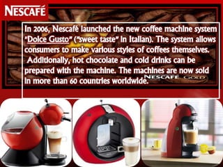 Nescafé is an instant coffee brand by Nestlé, introduced in Switzerland in 1938 and later in India in 1963. Initially known in the US, it was supplanted by the higher-priced 'Taster's Choice' brand. Factors influencing demand for Nescafé include taste, price, quality, and innovation.