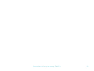 Nescafe and Bru are two major coffee brands in India. Nescafe leads the instant coffee market with a 55.3% market share. It has a wide range of instant coffee products. Bru is a filter coffee brand that is the market leader in that segment, with a market share 3 times larger than Nescafe's share of the instant coffee market. Both companies utilize various marketing strategies like promotions, pricing, and distribution channels to grow their business.