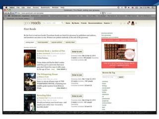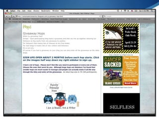 Kellie Celia provides tips for authors to build a community and promote their work through low-cost marketing initiatives. She recommends connecting with core audiences like other writers, teachers, and bloggers. Authors should build buzz by seeding their book to influential people and considering early promotions. For book launches, authors can harness social media, blogs, and local press through ideas like Twitter promotions and blog tours. Kellie provides recommendations for free tools to help with social media, blogs, and online publicity.