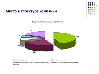 Документ представляет обзор состояния внутренний коммуникаций в России и включает обсуждение актуальных тем, таких как организация мероприятий и эффективность коммуникационных каналов. Обсуждаются проблемы отсутствия профессиональных стандартов и подготовительных систем, а также будущее создание профессионального сообщества. Констатируется рост числа специалистов в области внутренних коммуникаций на 250% с 2006 по 2008 год.