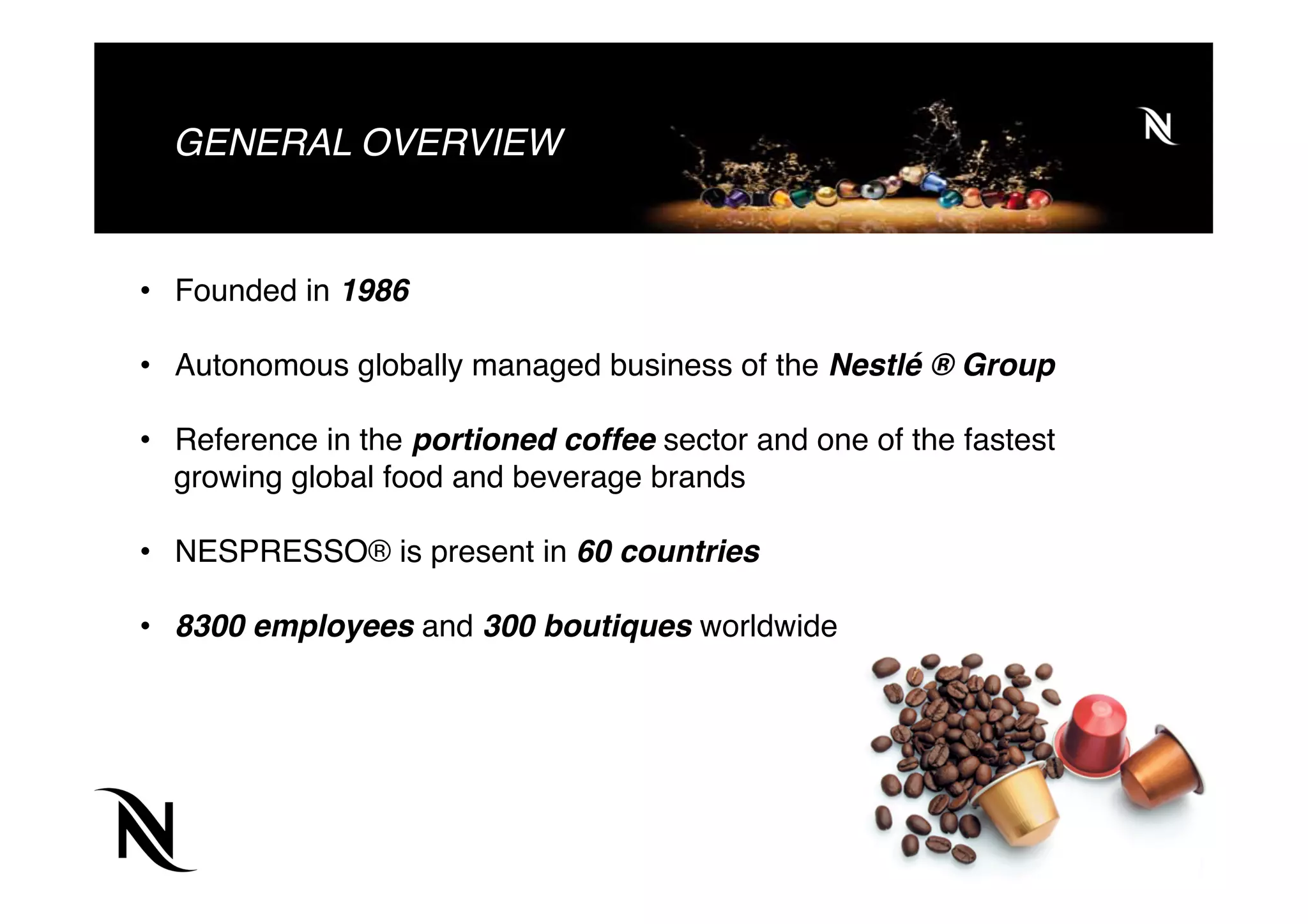 Nespresso is a globally managed business of Nestle founded in 1986 that specializes in portioned espresso coffee. It has 8,300 employees across 60 countries and 300 boutiques worldwide. Nespresso develops coffee machines and capsules to provide the perfect cup of espresso. It has a strong focus on quality coffee sourcing, product innovation, and customer experience. Nespresso has a competitive advantage through economies of scale in capsule production, brand reputation for quality, and an extensive distribution network. While facing competition from substitutes like filtered and instant coffee, Nespresso has grown its market share to 45% through superior marketing and technology.