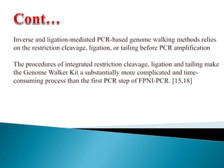 The document describes a method called Fusion Primer-based Nested Insertion PCR (FPNI-PCR) for amplifying unknown genomic DNA sequences. FPNI-PCR uses gene-specific primers and fusion primers containing an arbitrary sequence and known adaptor region. It was able to isolate 21 genomic sequences from 7 plant species in under 4 hours with 2 rounds of PCR and yielded fragments over 1kb in size. FPNI-PCR provided 100% specific amplification of target products and did not require DNA dilution steps, making it more efficient than other methods like TAIL-PCR.