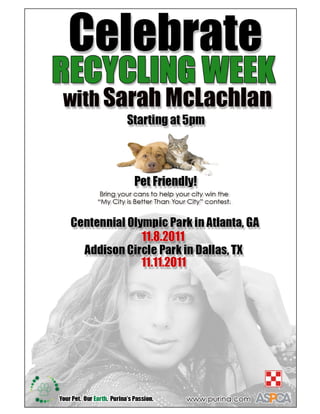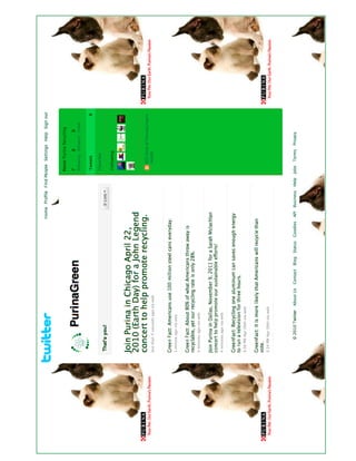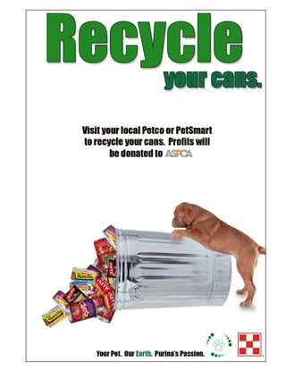 The campaign's tagline is "Your Pet. Our Earth. Purina's Passion" and uses traditional and non-traditional media to create awareness of Purina's relationship to recycling cans. Advertising will feature the tagline and new recycling logo on various mediums like billboards and magazines. Promotional items like a recycling bin and tote bag will also be distributed.