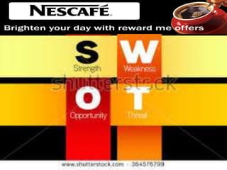 The document provides an overview of Nestlé's marketing strategies and history, highlighting key elements such as its product offerings, pricing, promotion, and distribution methods. Founded in 1866 by Henri Nestlé with headquarters in Switzerland, the company operates in 86 countries and employs over 280,000 people. It also includes a SWOT analysis detailing strengths, weaknesses, opportunities, and threats related to Nestlé's market presence, particularly in the Nescafé product line.