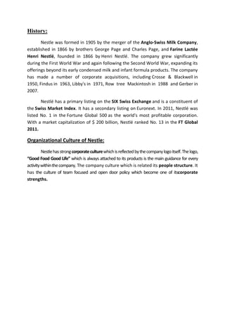 Nestle is the largest food and beverage company in the world, founded in Switzerland in 1866. It has over 300,000 employees worldwide and produces thousands of products including baby food, coffee, bottled water, and pet food. Nestle emphasizes teamwork and open communication in its organizational culture and leadership policies. It focuses on employee safety, training, and development to maintain a highly skilled global workforce.