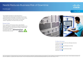 Nestlé implemented the Cisco Prime Network Control System with Dimension Data's assistance to enhance connectivity and visibility across its manufacturing facilities in South Africa. This system significantly reduced downtime risk and operational costs by enabling quick fault tracking and automatic wireless security management. As a result, Nestlé has improved its production processes and ensured reliable wireless connectivity in its new office.