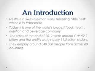 Nestlé is one of the world's largest food and beverage companies founded in 1866 in Switzerland. It produces a wide range of products from baby food to beverages to snacks. Nestlé employs over 340,000 people worldwide and had sales of over $92 billion in 2012. While Nestlé has strong brand recognition and distribution channels, it also faces threats from trends toward healthy eating and private label brands. The company aims to provide consumers with nutritious choices through extensive research and new product development.