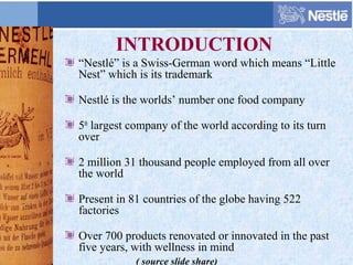 Nestle is the world's largest food and beverage company founded in Switzerland in 1867. It has over 2 million employees worldwide and produces over 700 products across 81 countries. Key acquisitions and joint ventures over the years include Cereal Partners, PowerBar, Ralston Purina, and L'Oreal. Nestle's mission is to provide consumers with nutritious and tasty food from morning to night. Kit Kat is one of Nestle's most popular brands employing strategies like product line extensions, consistent pricing, and promotional campaigns built around its iconic "Have a Break, Have a Kit Kat" slogan.
