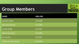 The document provides information about Nestle, a multinational food and beverage company headquartered in Switzerland. It discusses Nestle's product portfolio, marketing mix strategies including its focus on product quality and differentiation, pricing based on competitors and quality, distribution network, and promotional activities. It also analyzes Nestle's market segmentation approaches based on geographic, demographic, psychographic, and behavioral factors. Finally, it outlines Nestle's positioning strategies and provides suggestions to further improve its business.