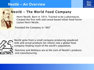 1. Nestlé is a global food and beverage company founded in 1867 that operates in over 70 countries and employs 254,000 people.