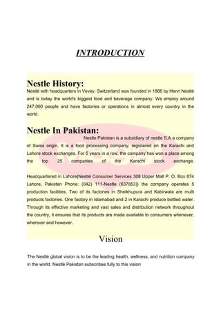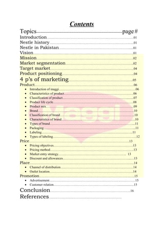 Nestle is a multinational food and beverage company founded in 1866 with headquarters in Switzerland. It operates globally including in Pakistan where it has 5 production facilities. Nestle's vision is to be the leading health and wellness company. The document discusses Nestle's marketing strategies in Pakistan, focusing on its popular Maggi product. It covers segmentation targeting middle and upper classes. It also discusses the 4Ps of marketing - product details on Maggi, pricing objectives to match market rates, nationwide placement, and promotional activities like TV ads.
