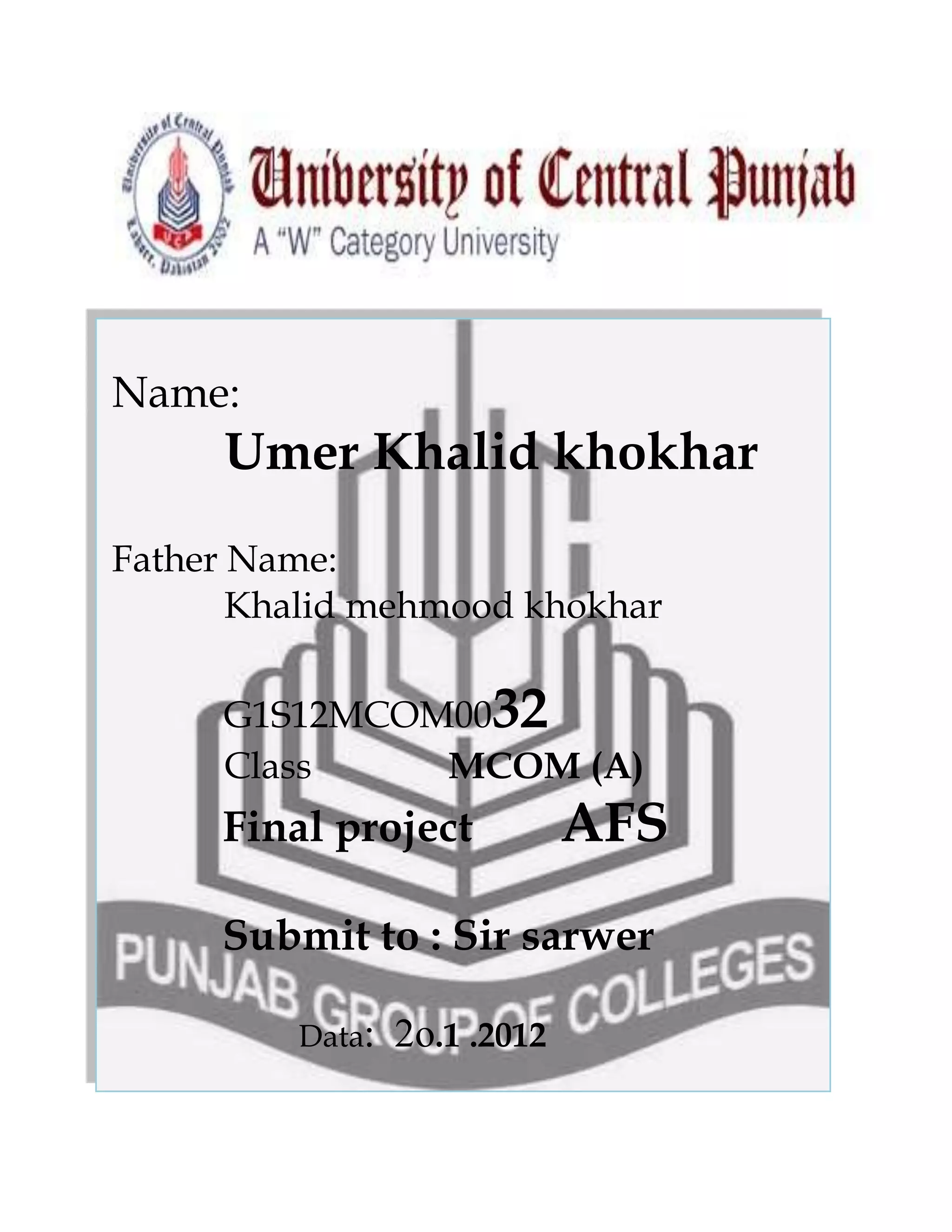 The document provides information about Umer Khalid khokhar's final project for his class MCOM (A) submitted on 20.1.2012 to Sir sarwer. It includes an executive summary analyzing Nestle Pakistan's financial position and performance through ratio analysis. The auditor's reports from 2008-2012 for Nestle Pakistan were unqualified, indicating the financial statements were prepared according to accounting standards and accurately reflected the company's financial records. The project examines Nestle Pakistan's liquidity, assets utilization, capital structure, profitability, and market value ratios to evaluate the company's financial health and make recommendations.