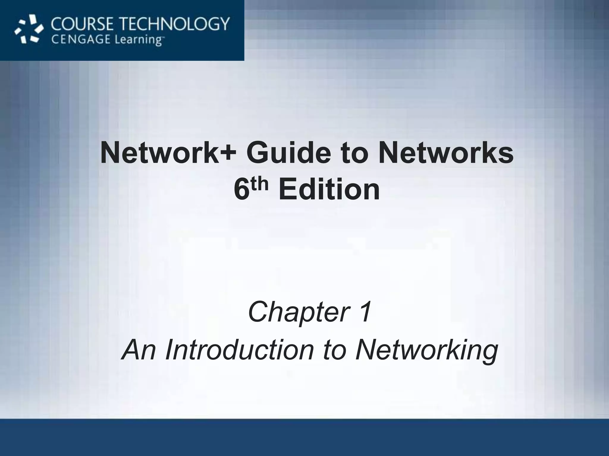 This document provides an overview of chapter 1 from the Network+ Guide to Networks, 6th Edition. It introduces networking concepts such as peer-to-peer and client/server networks. Peer-to-peer networks allow direct communication between equal nodes, while client/server networks use a centralized server to manage shared resources. The document also discusses common network types like LANs, MANs, and WANs and elements of client/server networks including clients, servers, network cards, and protocols. Finally, it outlines several common uses for networks such as file and print sharing, remote access services, and email communication.
