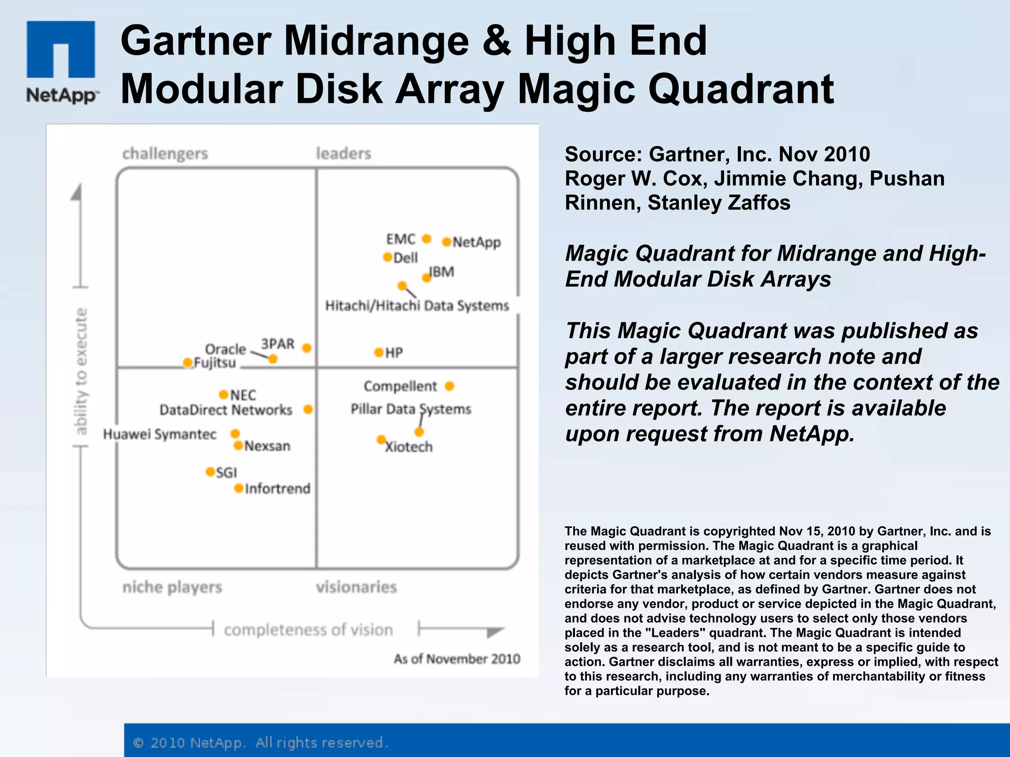 Документ представляет анализ возможностей хранения данных от компании NetApp, включая их позиции в Magic Quadrant от Gartner. Обсуждаются основные тенденции в области виртуализации, облачных технологий и управления данными, а также даются рекомендации по best practices для оптимизации ИТ-инфраструктуры. В документе подчеркивается значимость унифицированной архитектуры и интегрированной защиты данных для повышения эффективности и снижения затрат.