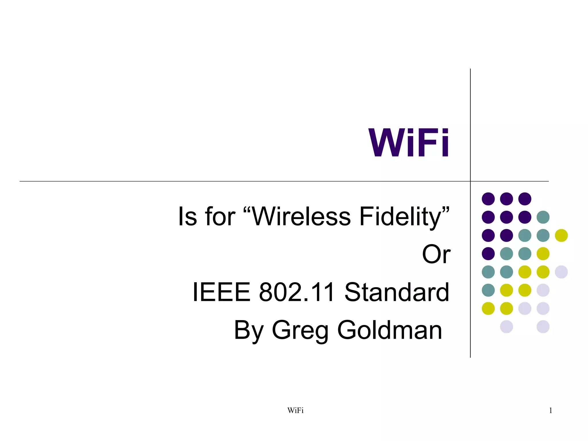 The document discusses key aspects of the IEEE 802.11 wireless networking standard, including: