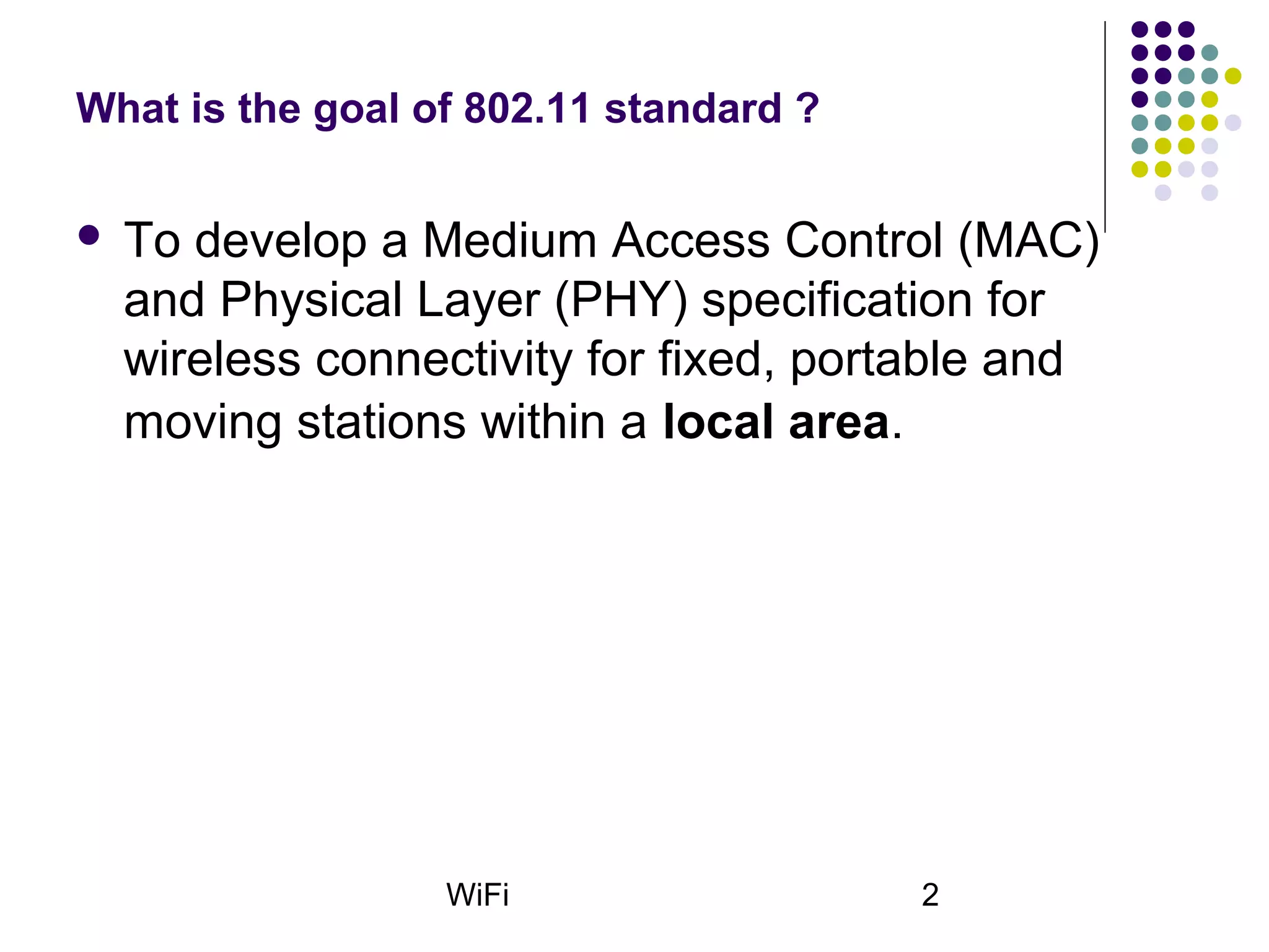 - The 802.11 standard aims to specify wireless connectivity for fixed, portable, and mobile devices within a local area.